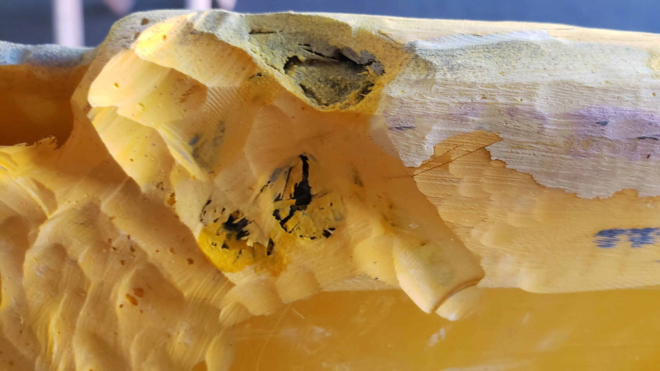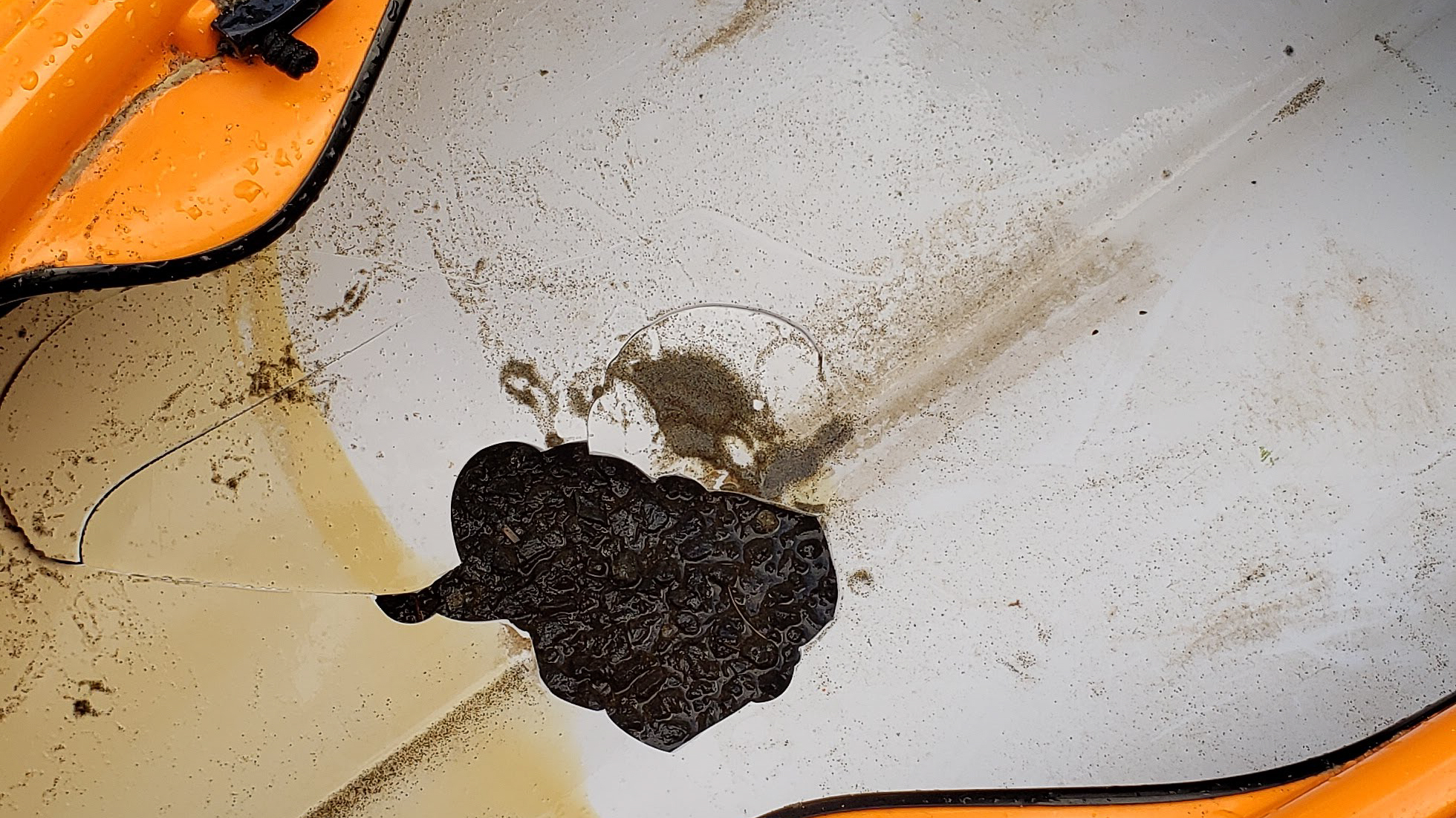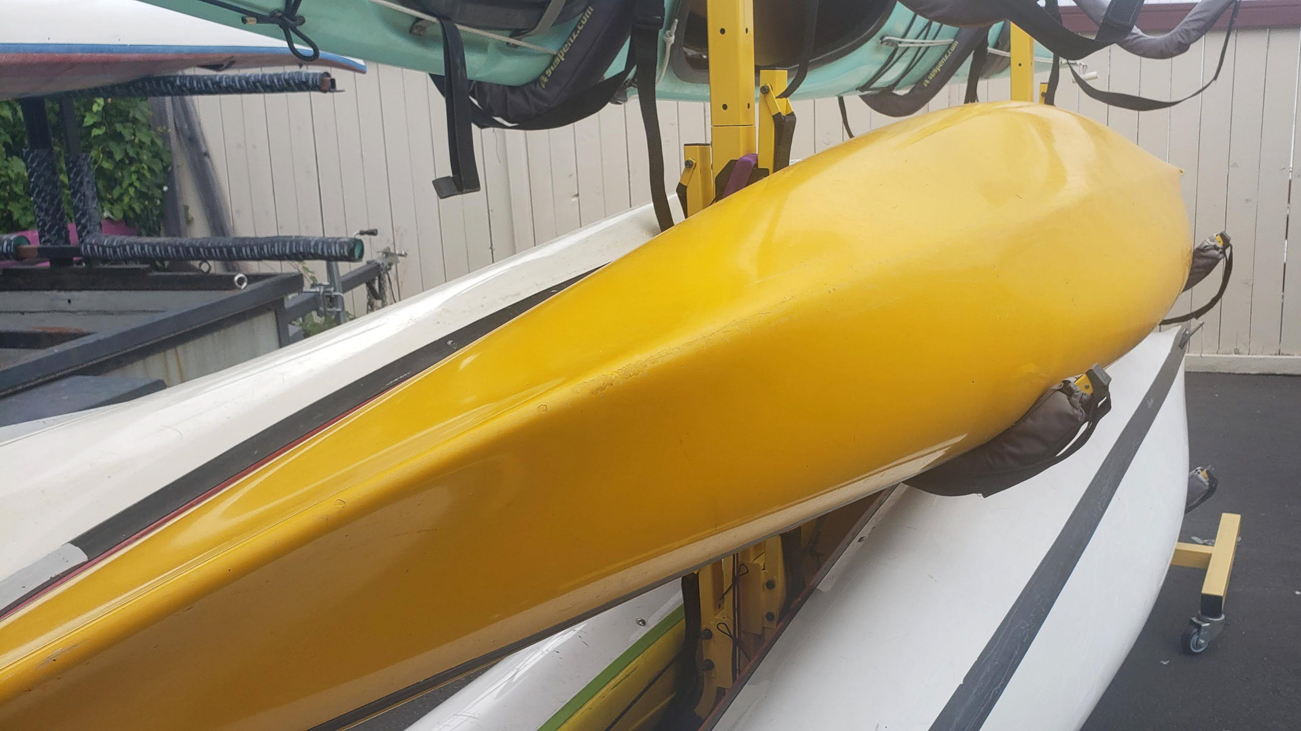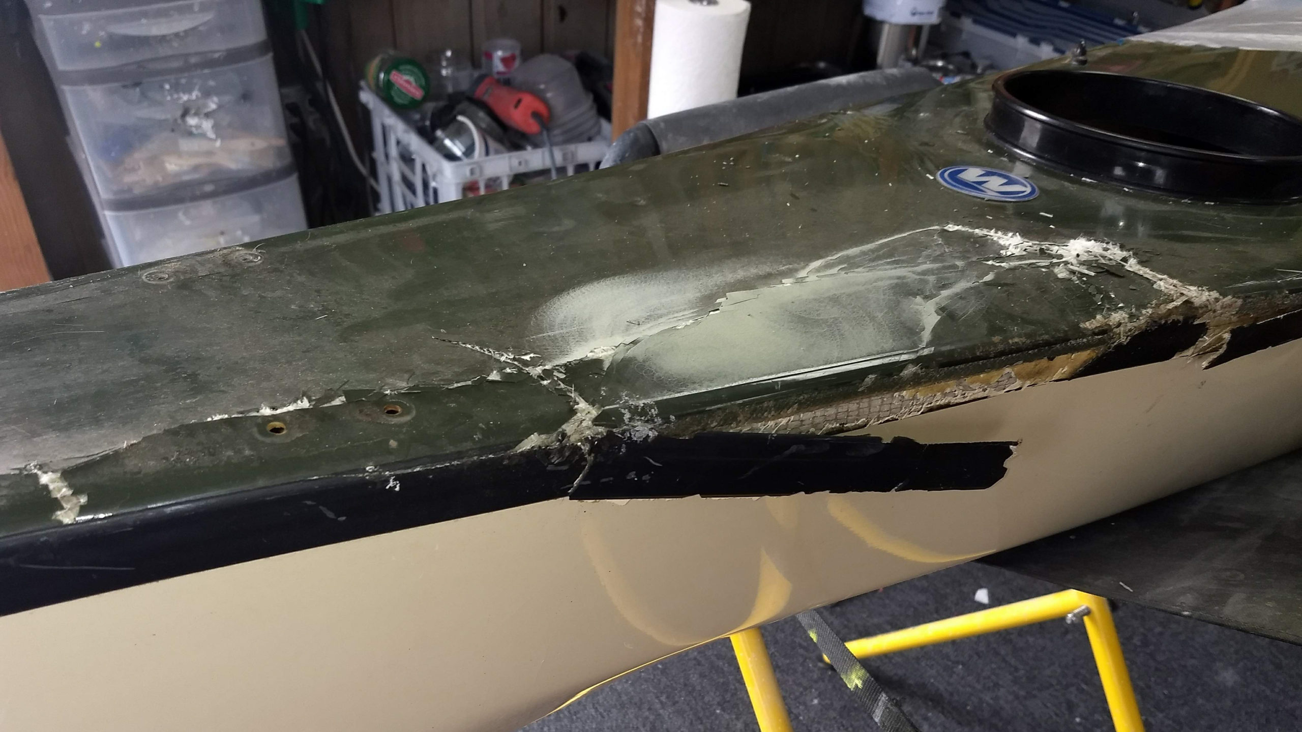 This kayak was stored outside and during a wind storm a tree came down on top of the Kayak causing extensive damage to the Deck, Seam and Hull.