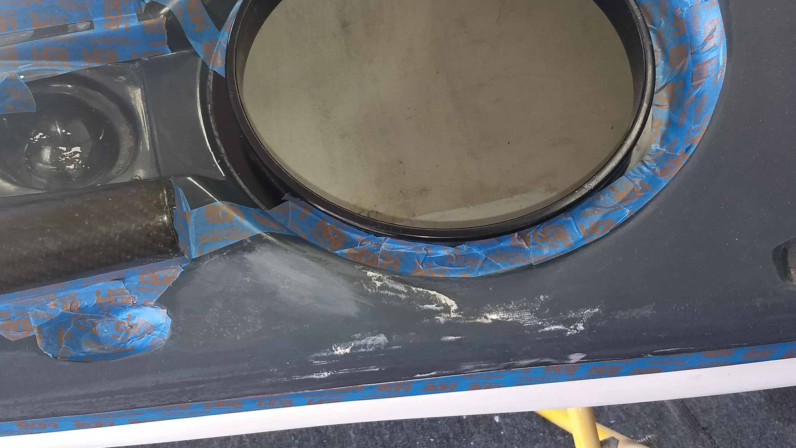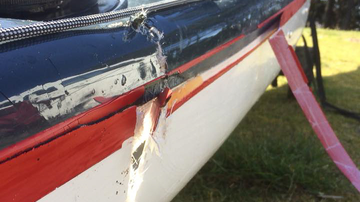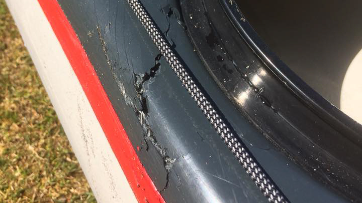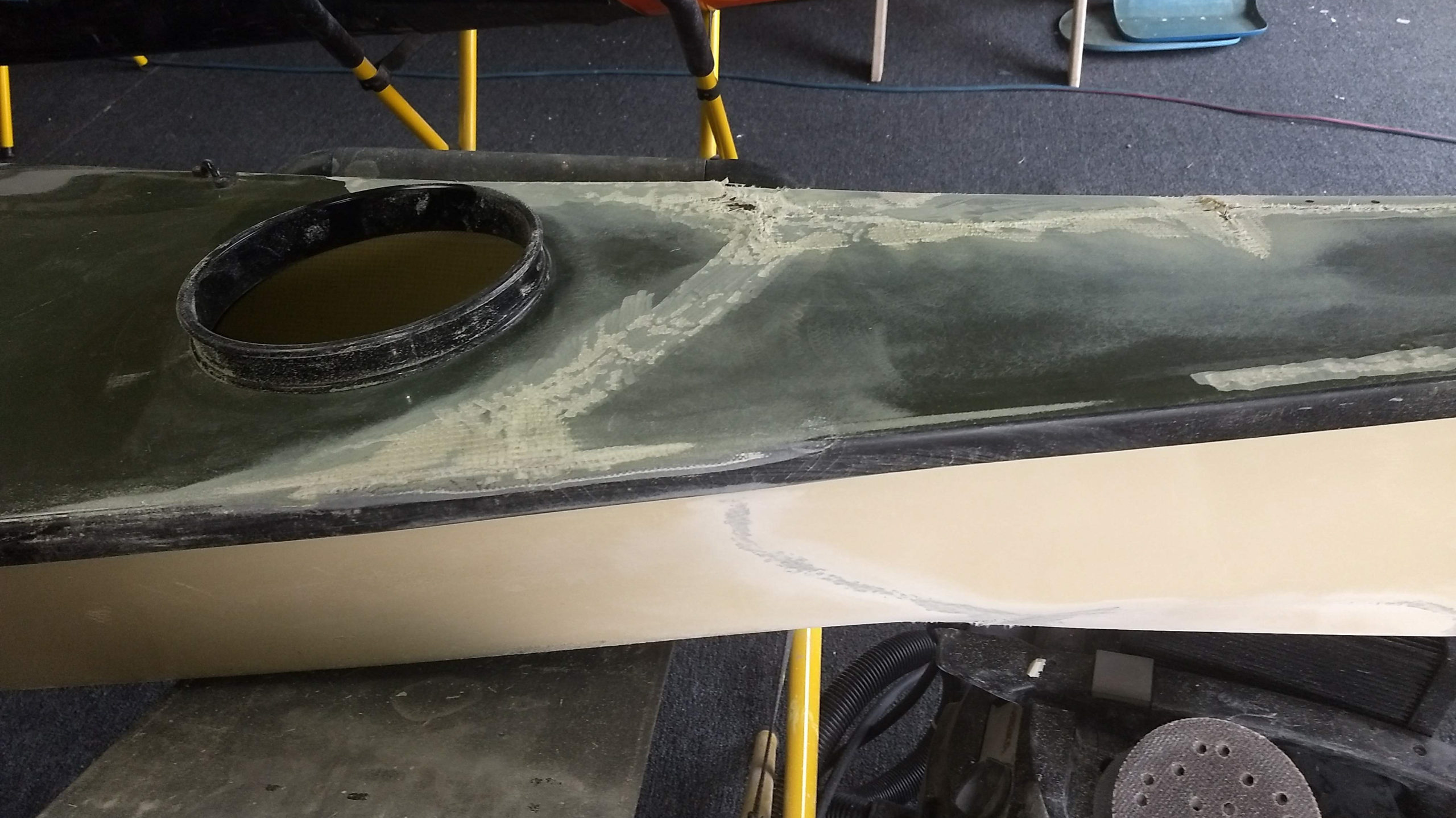 The hole in the bottom of this boat was sustained when 2 boats were playing too close together in the surf. The bow of another boat pierced the hull.