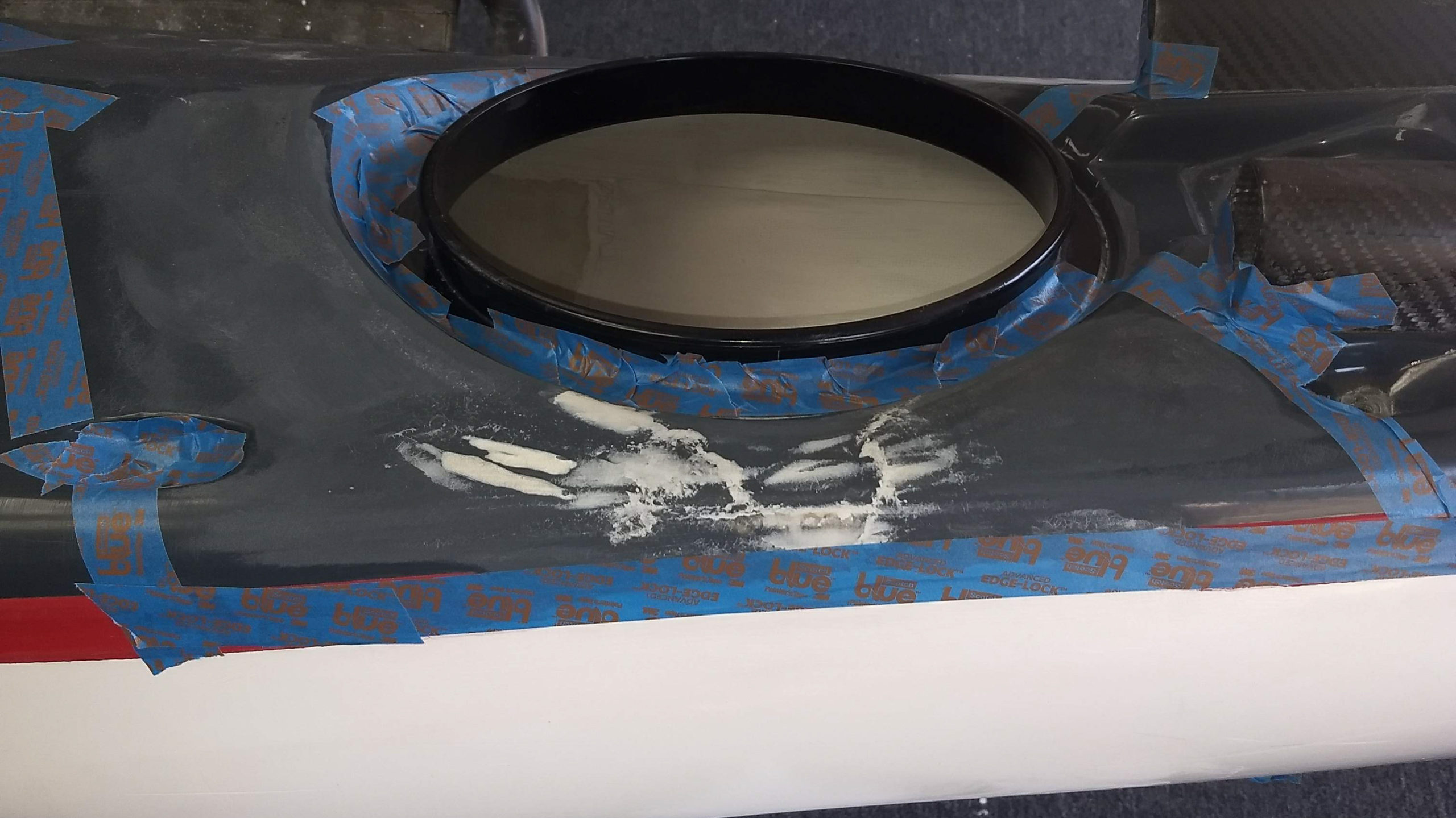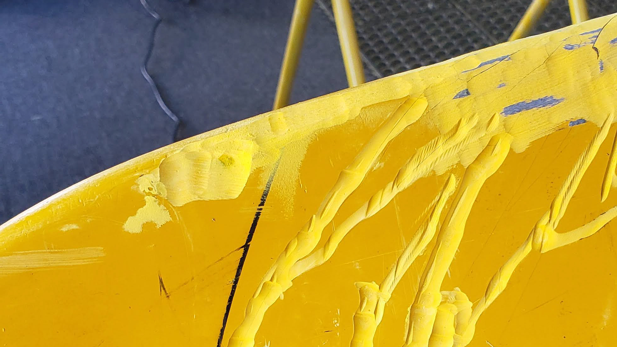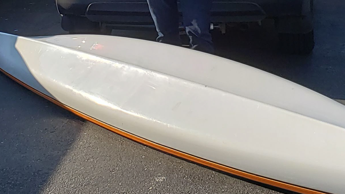 This was caused when a paddler was caught by a larger wave too close in and the wave stood up fast and steep and as the boat began to be surfed, the bow buried in the water and was pile driven right into the sandy bottom nearly snapping the bow off! While it was here we restored the deck back to a high gloss shine too!